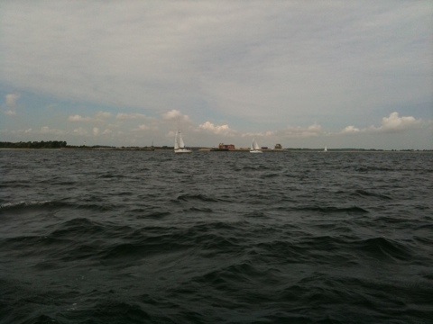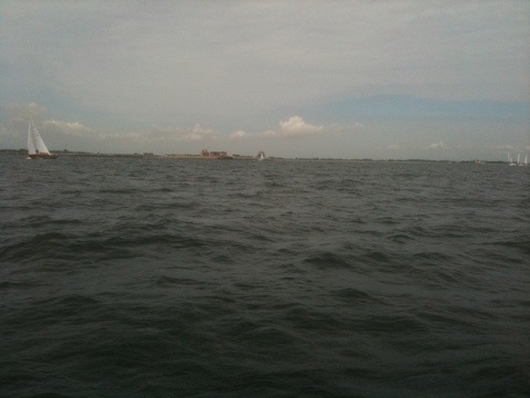 Passieren Olpenitz. Es geht hier scheinbar nicht so richtig voran. Nur eine handvoll Häuser sind fertig, ganz vorne sind die beliebtesten Bauplätze bebaut. Ein Segler fährt rein, ich weiss garnicht ob der Hafen fertig ist. Wir laufen dran vorbei mit inzwischen 5 kn schöner Fahrt und sonnigem Wetter. Over