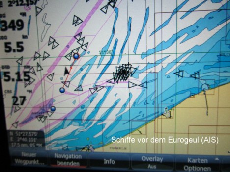 Eine kurze Info für die Nichtsegler: AIS heißt Automatic Identification System. Seit einigen Jahren sind alle größeren Schiffe (über 300 Tonnen) verpflichtet, ihre Schiffsdaten auf einer UKW Frequenz regelmäßig auszusenden. Aber inzwischen haben auch viele kleinere Schiffe einen solchen Sender (auch die Stella). Die Empfangsgeräte zeigen die Schiffe auf einem Display an.