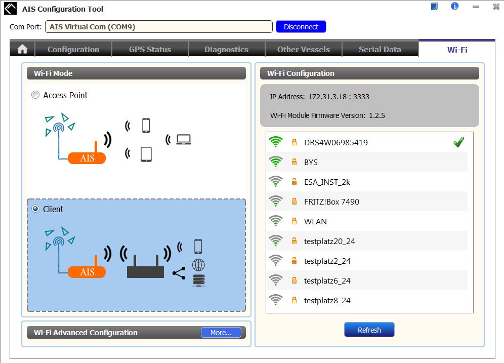 Der AMEC Camino 108W in der neuen Version kann am Windows PC in den Client Modus geschaltet werden und sich dann mit der Furuno DRS4W W-LAN Radar Antenne verbinden. Dazu wird die Furuno Antenne in der Liste ausgewählt, Connect kicken und das Furuno Passwort eingeben.