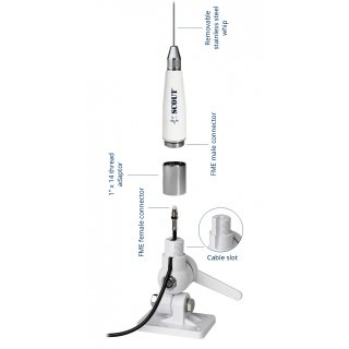 Die Antennen sind mit einem FME Stecker ausgestattet und dem Lieferumfang liegt ein 5m Koaxialkabel mit 2 bereits montierten FME-Buchsen und ein FME auf PL Stecker Adapter bei. Dadurch müssen Sie an Bord nicht mehr löten. FME Buchsen sind nur etwas dicker als das RG58 Kabel, sodass sie sich oft an Bord gut verlegen lassen.